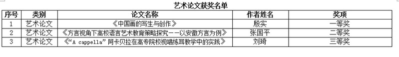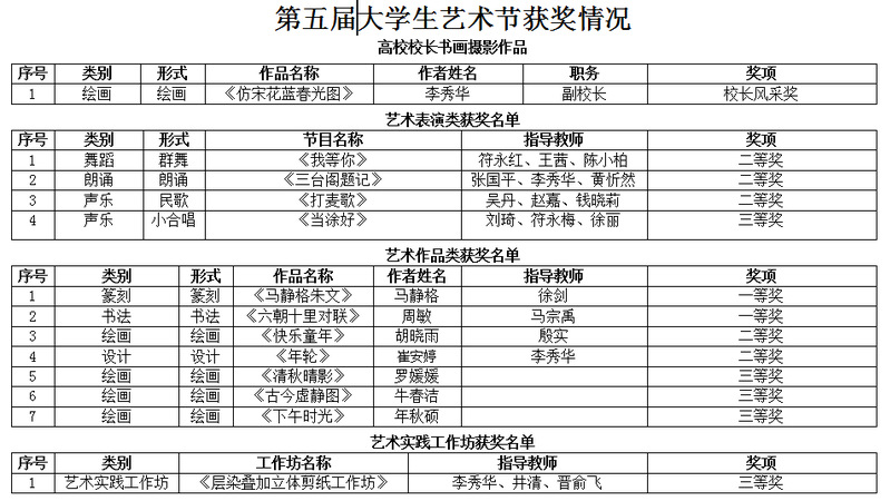 张国平首先宣读安徽省第五届大学生艺术展演活动我校获奖名单,参赛师生在此次展演活动中收获颇丰,共获国家级一等奖1项,省级一等奖3项,二等奖5项、三等奖7项。其中,我校李秀华副校长的摄影作品《仿宋花蓝春光图》获全省高校校长书画摄影作品“校长风采奖”。徐剑指导的篆刻作品《马静格朱文》荣获国家级一等奖,马宗禹指导的书法作品《六朝十里对联》、殷实的艺术论文《中国画的写生与创作》荣获省级一等奖。朗诵《三台阁题记》、舞蹈《我等你》、新编当涂民歌《打麦歌》、绘画《快乐童年》、艺术设计《年轮》荣获省级二等奖。绘画《清秋晴影》、《古今虚静图》等作品荣获省级三等奖。