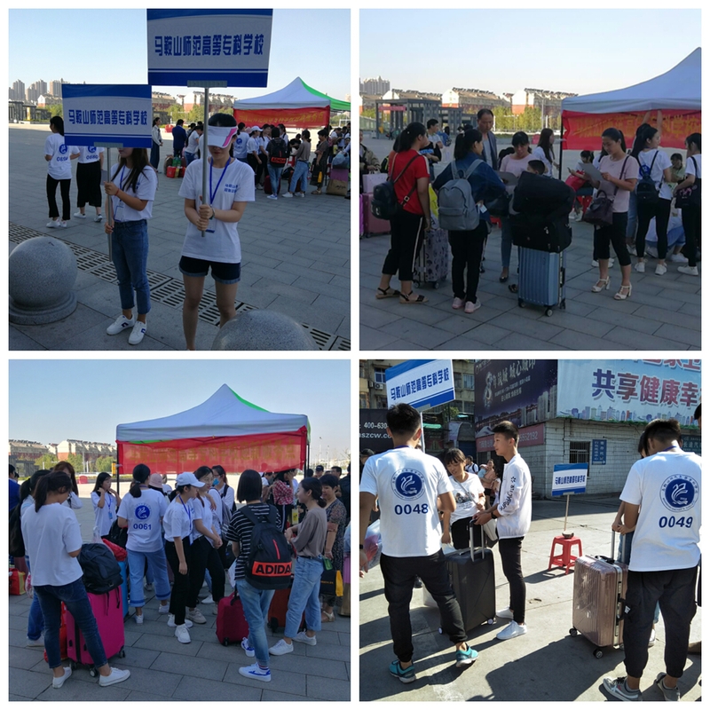 9月8日一早,志愿者们身着印有统一标识的T恤,佩戴着工作证。6:15准时到达一号门集合,一同乘车前往相应的服务站点就位,分工明确,细致周到。为了保证新生可以安全抵达学校,马鞍山师专分别在火车站、长途汽车站、旅游汽车站、高铁站设立接待点。志愿者们高举“马鞍山师范高等专科学校”标志牌,于各个车站的出站口处等待新生出站,新生刚到出站口,志愿者便将其引导车内。随后,志愿者便帮着新生和家长搬运行李……各个环节有条不紊,确保新生顺利入校。