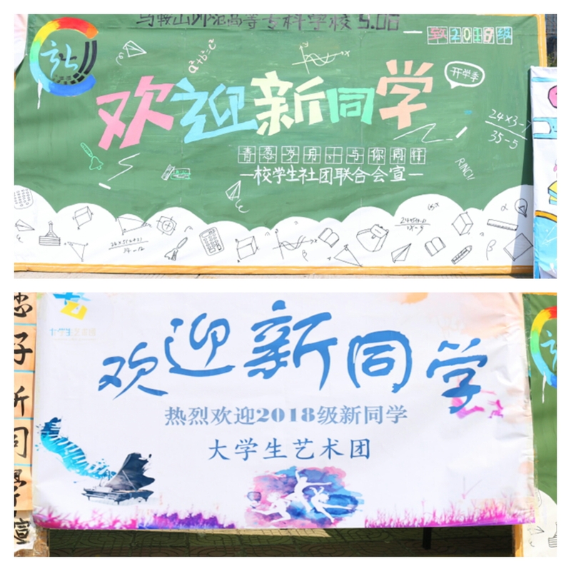此次迎新的另一“亮点”则是四大组织各自靓丽醒目的迎新展板。每个组织在展板上下足功夫,用最浅显易懂的方式来展示所在组织的特色风格。“钢琴”和“舞蹈”是他们的标志,绚丽的色彩展现了大艺团的青春和活力。“青葱岁月,与你同行”,志愿者们用简单的话语,则表达出了不普通的情感。四块鲜艳的展板和迎新横幅交错辉映,校青年志愿者服务队队长李雪峰表示到,“我们通过这个简单的细节,来让新生知道我们非常高兴他们的到来,也非常荣幸他们能成为我们的学弟学妹,和我们一样成为师专的一份子。”