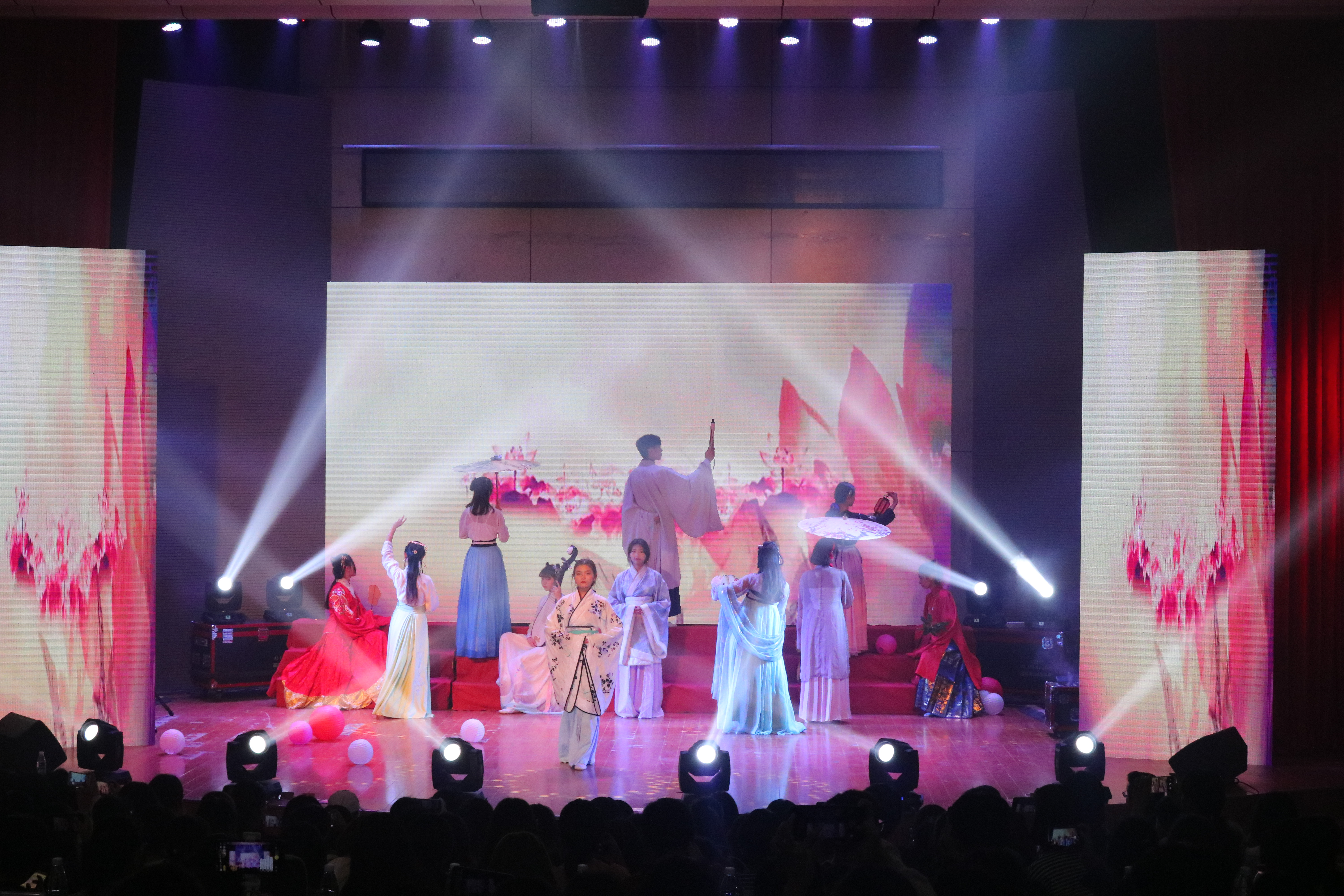 晚会开场,一首《国家》拉开了整场晚会的帷幕。“国是我的国,家是我的家。我爱我的国,我爱我的家。”学生们用整齐划一的动作和动人心弦的歌声将家国的情怀无限表达,迎来了在座观众热烈的掌声。紧接着,由18级经管系学生潘如和教师教育系学生王爽共同演绎的《昭君出塞•不旧人》让在场观众如身临昭君的悲壮和大漠狂风的场景之中,感受昭君之美而意犹未尽。在节目《拉丁舞》中,舞者们将青春与活力融合。当音乐响起时,台上的青年舞者们用精湛的舞技赢得了台下观众由衷的赞叹。相声表演《学外语》更是笑点层出。他们用诙谐幽默、轻松搞笑的语言艺术征服了现场观众。