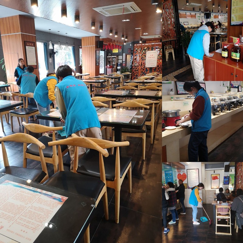 早课结束后,志愿者们在善食馆工作人员的安排下都积极的参与到打扫卫生的队伍中去。扫地,擦桌子,扫灰等,每位志愿者都认真完成着自己的任务。从迎宾、发光盘劵到打扫卫生、搬运餐具,志愿者为每位客户都提供了最热情,最全面的服务。在陆续到来的客人中志愿者们发现有很多的老年人和小朋友,有些老年人也许行动并不是很方便,但他们还是愿意不辞辛苦来到善食馆献出自己的一份爱心。而小朋友们则在父母的教导下,学会了什么是感恩,什么是善良,而这正是志愿者最根本的本质。