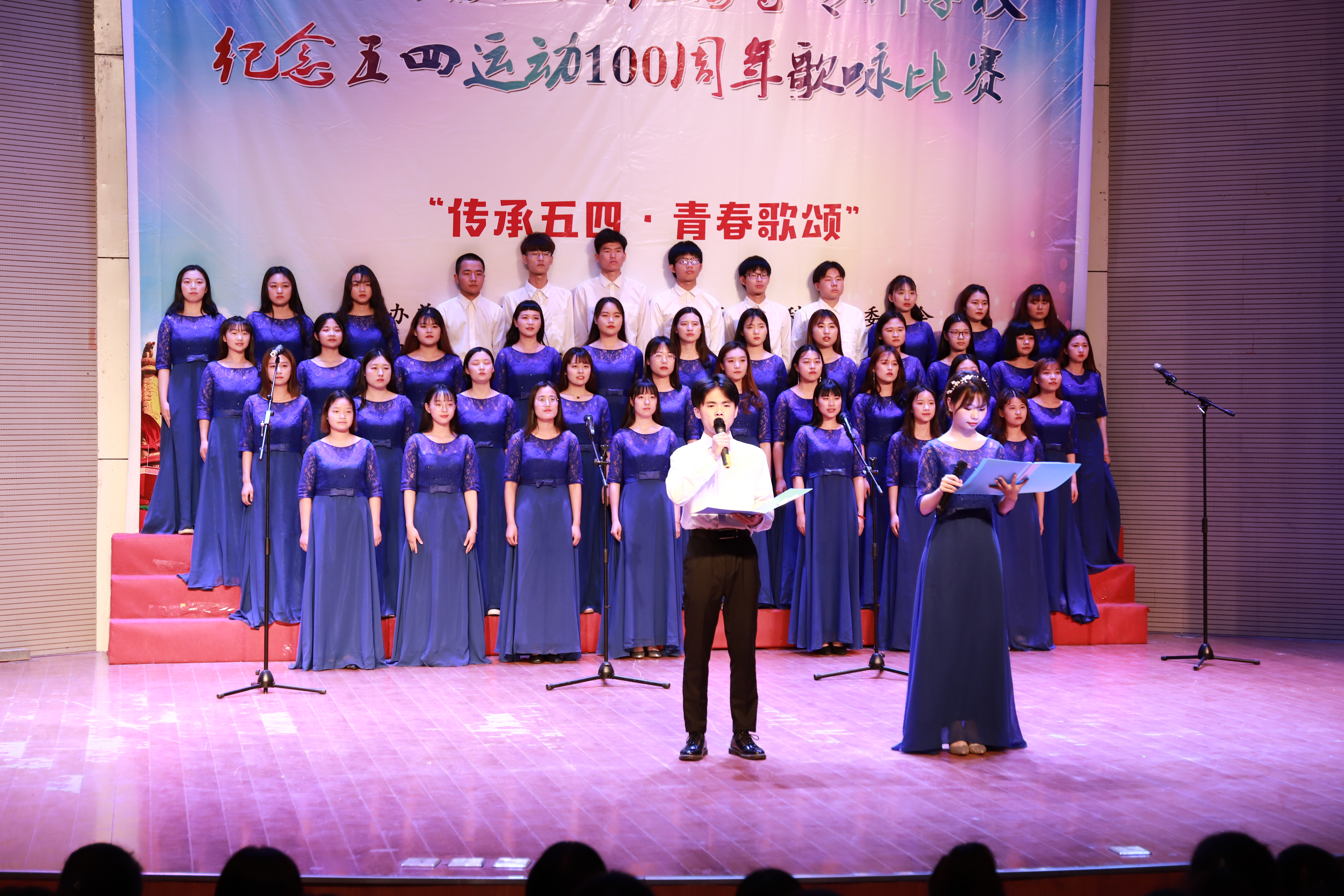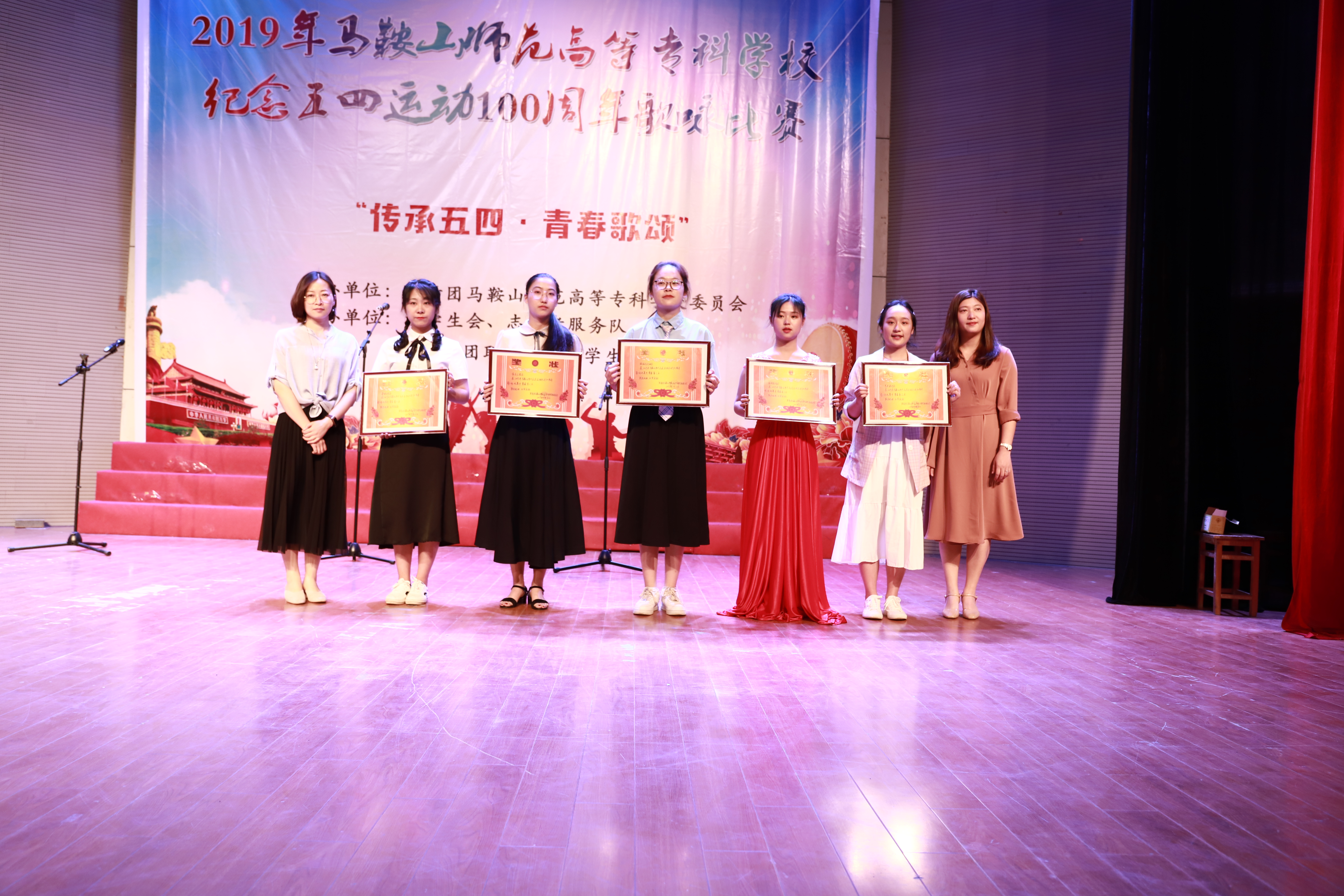 本网讯为纪念五四运动100周年,进一步弘扬“爱国、进步、民主、科学”的五四精神,展现新时代大学生精神面貌,由校团委主办的2019马鞍山师专纪念五四运动100周年大学生歌咏比赛于5月23日晚在音乐厅举行。软件工程系党总支副书记王莉娟、校团委负责人 副书记张国平、教师教育系副主任陈小凤担任嘉宾出席现场,教师教育系音乐专业教师秦睿睿、钱晓莉、张艺然担任比赛评委,各系团总支书记出席并参加比赛。
