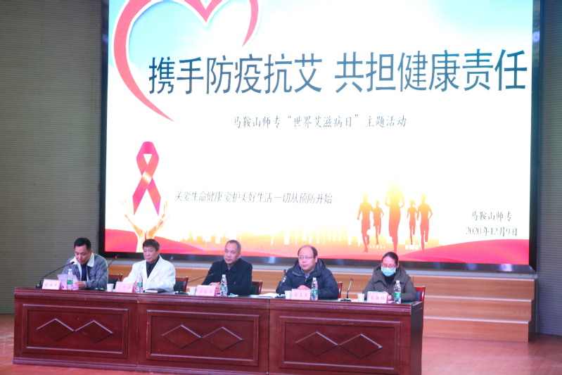 本网讯 2020年12月9日由马鞍山市卫健委、疾控中心主办,马鞍山师专承办的 “携手防疫抗艾,共担健康责任”主题宣传活动在我校开展。12点30分在音乐厅举办了本次主题宣传活动的启动仪式,市疾控中心主任娄金海、校总务处处长周志亮、校团委负责人、副书记张国平以及五百余名志愿者参加活动,启动仪式由周志亮主持。