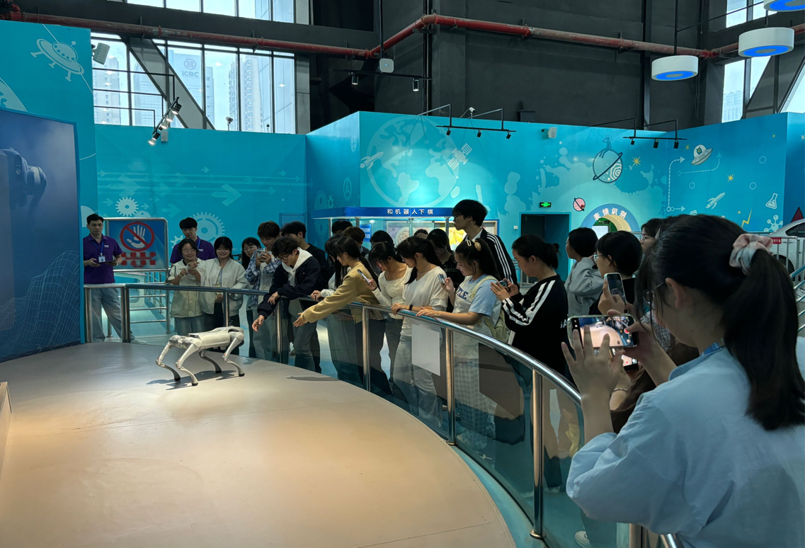 在科技馆讲解员的带领下,同学们来到了“引领科技”展区。一只憨态可掬却身手敏捷的机械狗吸引了大家的全部注意力。它时而稳步前行,时而灵活转弯,还能在模拟复杂地形上轻松跨越障碍。讲解员介绍,这只机械狗搭载了先进的人工智能控制系统和高精度传感器,能够在救援、勘探、物流等领域发挥重要作用。同学们看得目不转睛,不时发出阵阵惊叹,纷纷举起手机记录下这一科技“萌宠”的精彩瞬间。
