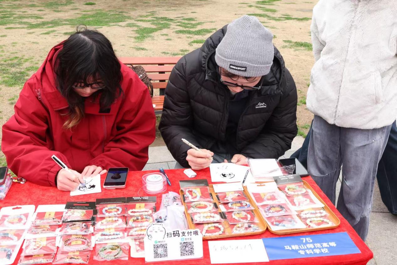 艺术设计学院的义卖摊位前,摆满了学生们利用课余时间精心制作的手工串珠饰品。色彩斑斓的串珠在阳光下闪闪发光,造型别致的小动物、精巧雅致的手链挂件,每一件都凝聚着学子们的巧思与汗水。本次义卖的所有产品统一定价5元,价格亲民却饱含真情。不少市民被这些精美的手工艺品吸引,纷纷驻足欣赏、慷慨解囊。“这些都是孩子们亲手做的,既有心意又有创意!”一位市民拿着刚买下的串珠挂件连连称赞。